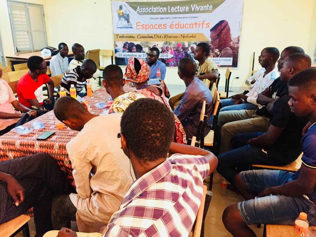 Comme l'indique l'une de nos valeurs : <>, ce faisant, Lecture Vivante a initié les espaces éducatifs (centre aéré ou encore vacance découverte), un projet approuvé et financé par l'ambassade de France au Mali à travers le projet <>. Ce projet régional s'est articulé autour d'un ensemble d'activités qui se sont adressées aux jeunes et scolaires. Il a favorisé la rencontre, l'éducation et à mit en évidence l’éducation et la culture. Ce projet s'est exprimé avec des activités comme : Animations et atelier culturels, causeries éducatives, les sorties éducatives et heures du conte et deux ateliers de renforcement de capacités de l’équipe de Lecture Vivante. Le tout couronné par un concours d'art oratoire qui s’est déroulé en deux phases (2) phrases : une phase éliminatoire (dans les 5 cercles de Tombouctou) et une phase finale qui s’est tenue à Tombouctou le chef-lieu de la région.
